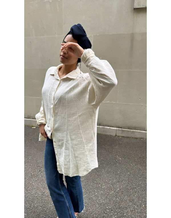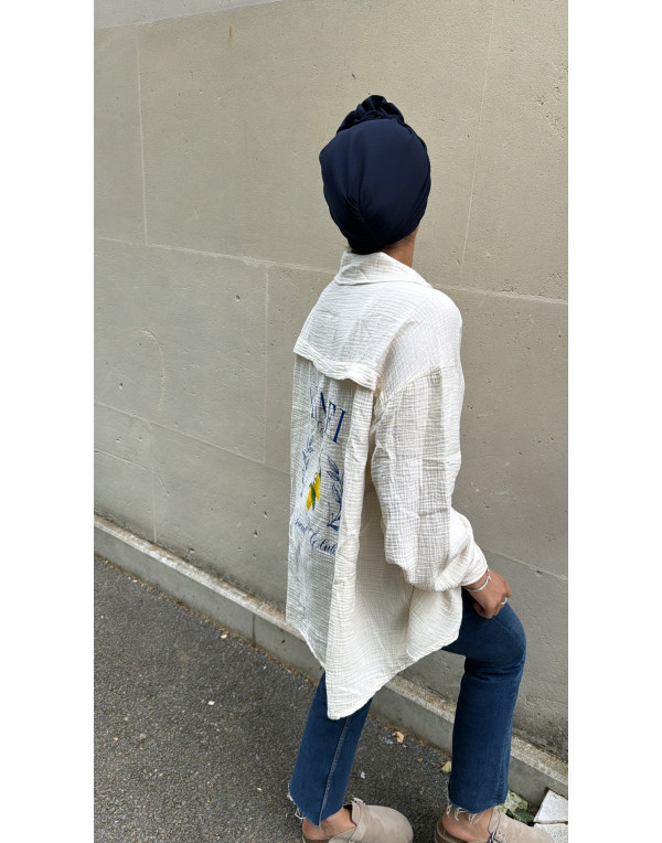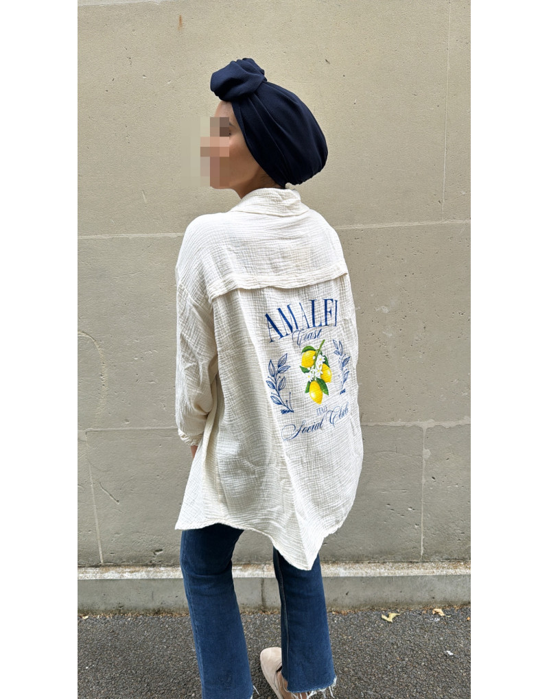 Chemise oversize longue beige, élégante et confortable, idéale pour la saison estivale. Son devant épuré offre un style simple et chic, tandis que son dos se dévoile avec un dessin original de citron et de fleurs bleu marine, apportant une touche fraîche et colorée à votre tenue. Une pièce habillée qui allie douceur et légèreté, parfaite pour ajouter une note d’originalité à vos looks d’été.