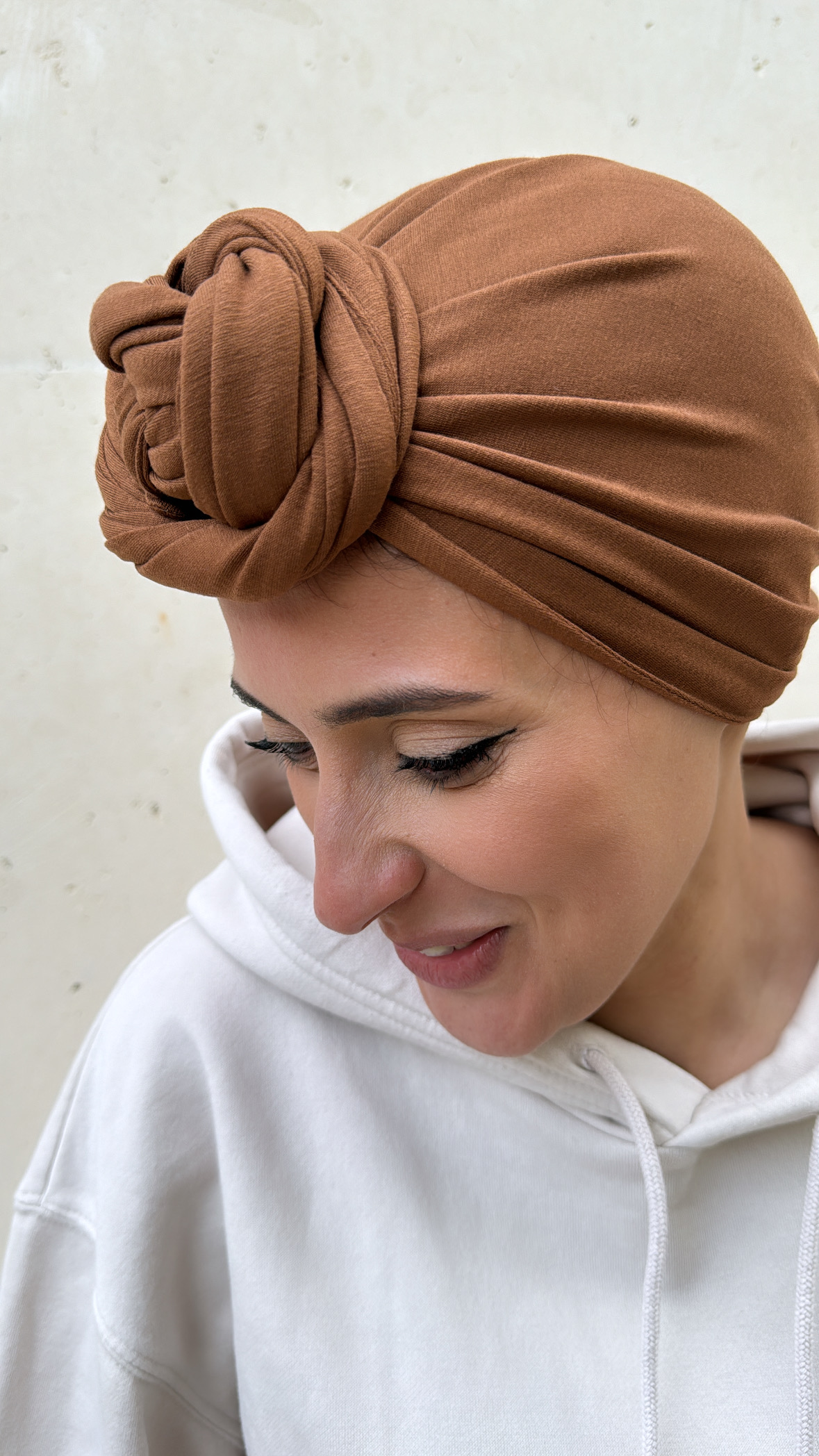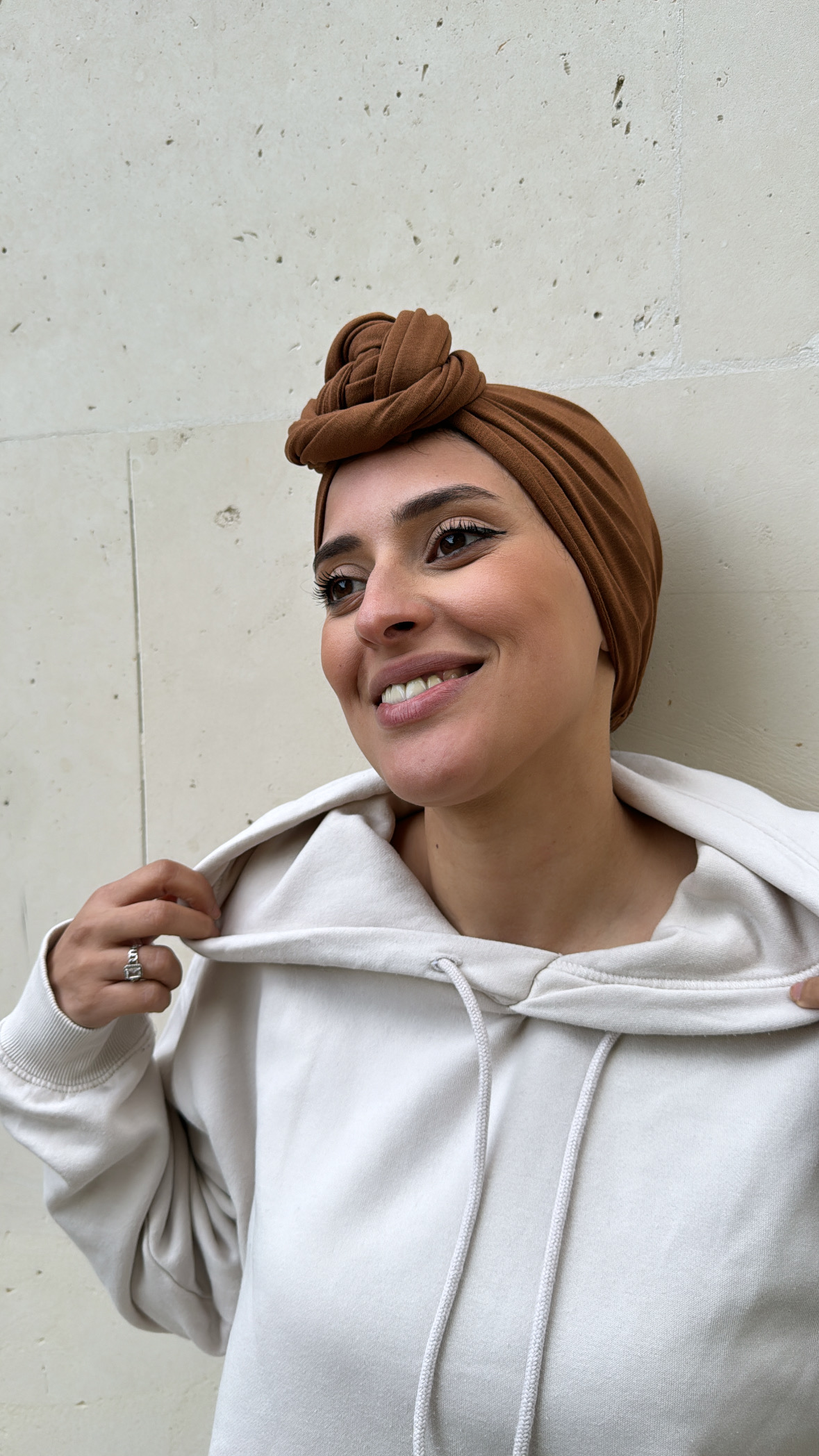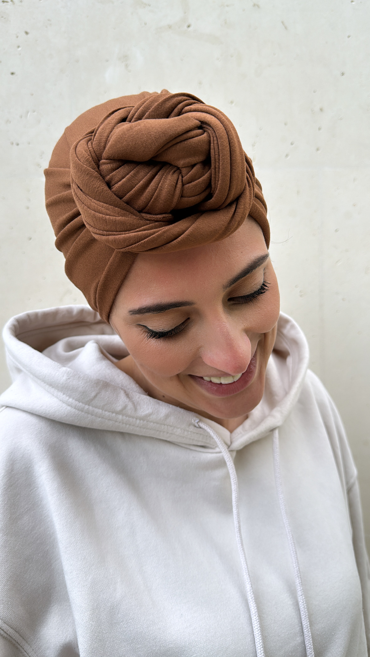Ce turban en jersey de coton cognac se distingue par sa douceur et son confort incomparable. Sa matière souple, respirante et extensible épouse parfaitement la tête pour un port agréable tout au long de la journée. Sa teinte cognac, chaleureuse et sophistiquée, apporte une touche d’élégance intemporelle à vos tenues, qu’elles soient sobres ou colorées.