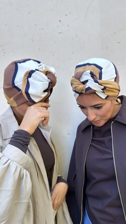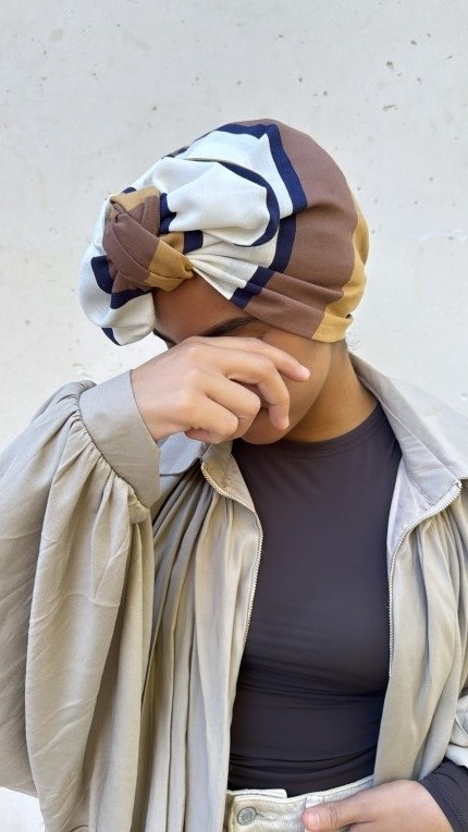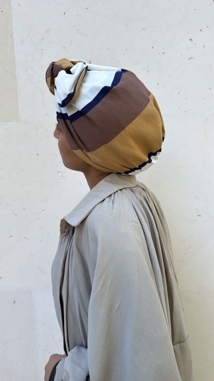 Ce turban Marina en coton-lin séduit par sa matière naturelle, douce et respirante. Il présente un motif raffiné composé de trois larges bandes blanc, beige et marron, rehaussées d’un fin trait bleu marine, aux teintes tendances de l’automne, parfaites pour apporter chaleur et élégance à vos tenues. Léger et confortable, il s’adapte à toutes les saisons et à tous les styles.