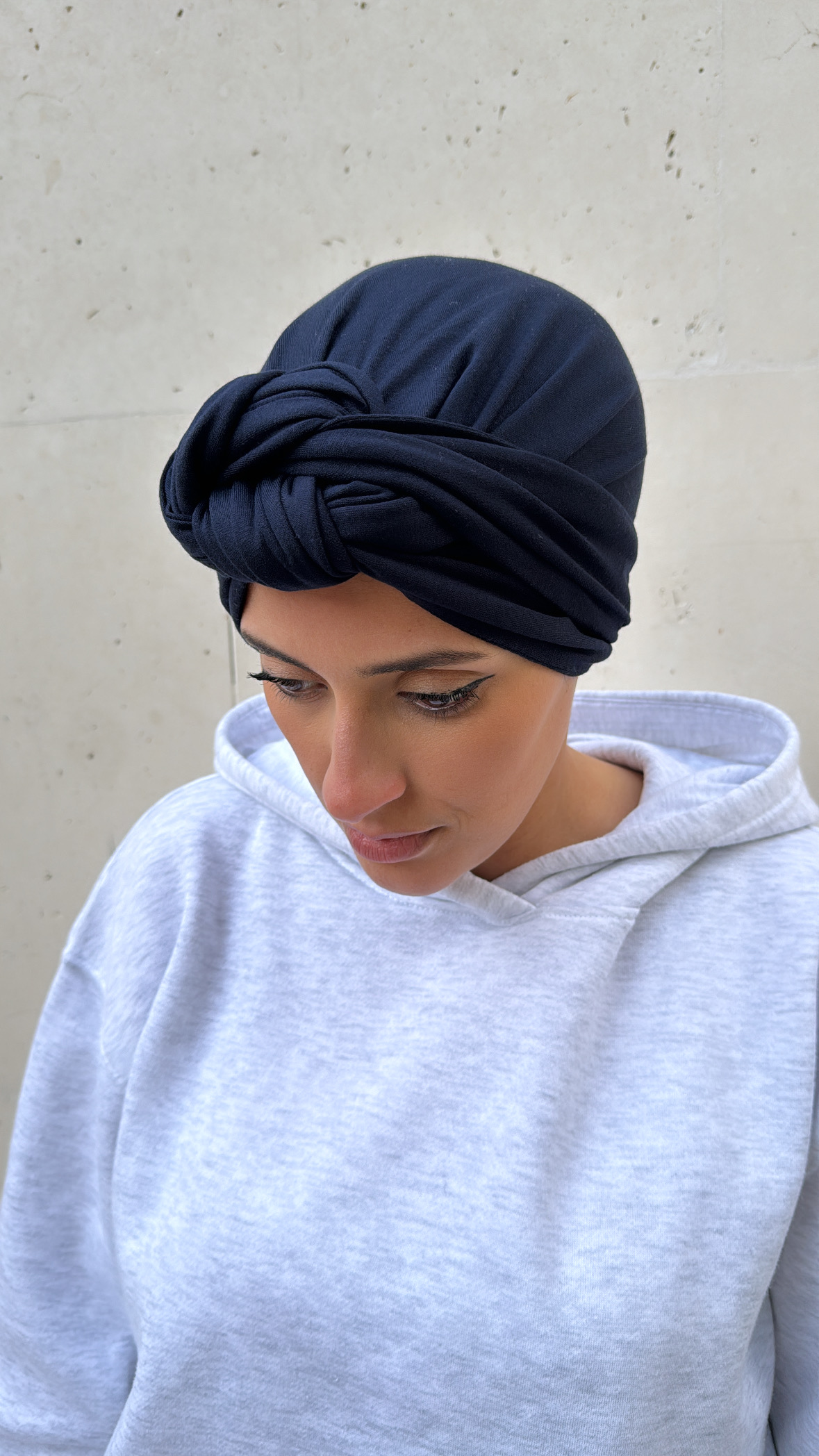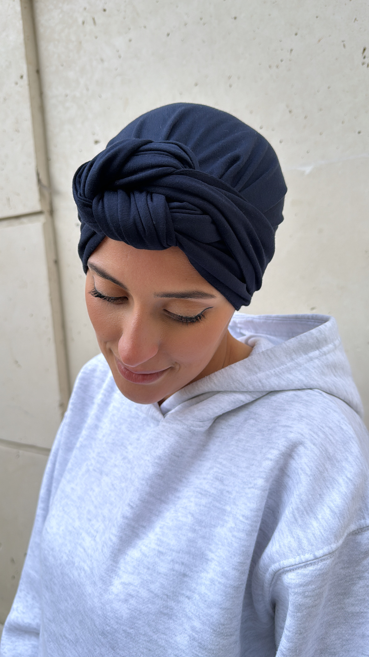 Turban en jersey coton basic (assez extensible). Une couleur basic qui va avec tout, un jean, une chemise blanche avec ce turban et vous voila prête!