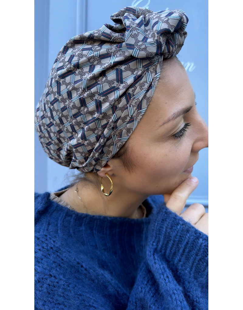 Adoptez un style chic et sophistiqué avec ce turban en mousseline ultra-légère, orné de motifs chaînes raffinés dans des teintes intemporelles : vert profond, rouge intense, doré discret et beige doux. Sa matière fluide et aérienne en fait l’accessoire parfait pour sublimer vos tenues estivales tout en apportant une touche d’élégance subtile.