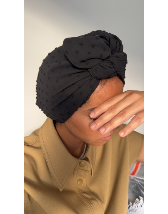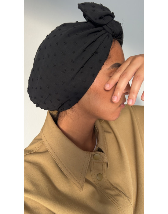 Ce turban Baïa en mousseline noire incarne l’élégance intemporelle dans sa forme la plus pure. Son noir profond est subtilement travaillé avec des détails ton sur ton discrets, jouant sur la texture et le relief pour créer une allure raffinée et harmonieuse. Sans plissé, il offre une ligne épurée et un tombé fluide, idéal pour un style sobre, chic et universel.