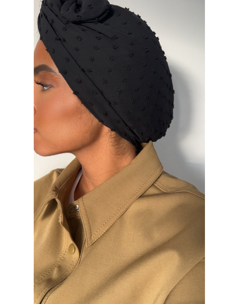 Ce turban Baïa en mousseline noire incarne l’élégance intemporelle dans sa forme la plus pure. Son noir profond est subtilement travaillé avec des détails ton sur ton discrets, jouant sur la texture et le relief pour créer une allure raffinée et harmonieuse. Sans plissé, il offre une ligne épurée et un tombé fluide, idéal pour un style sobre, chic et universel.