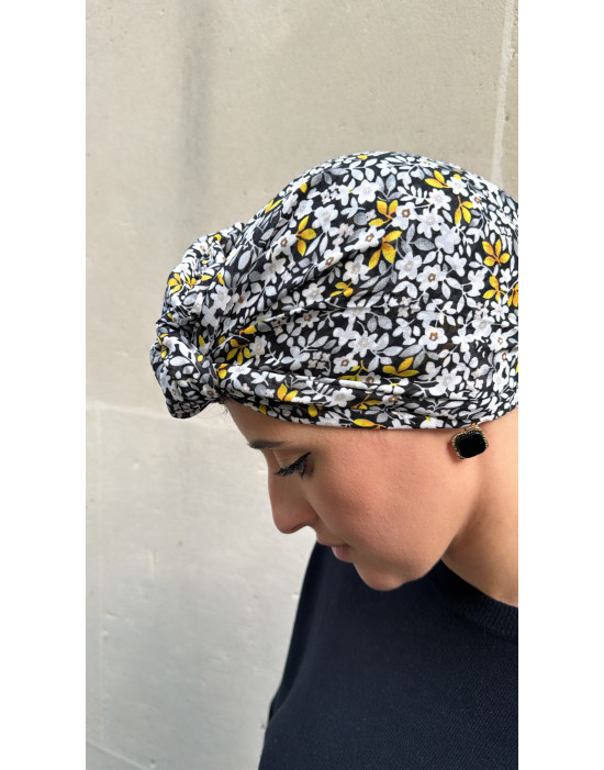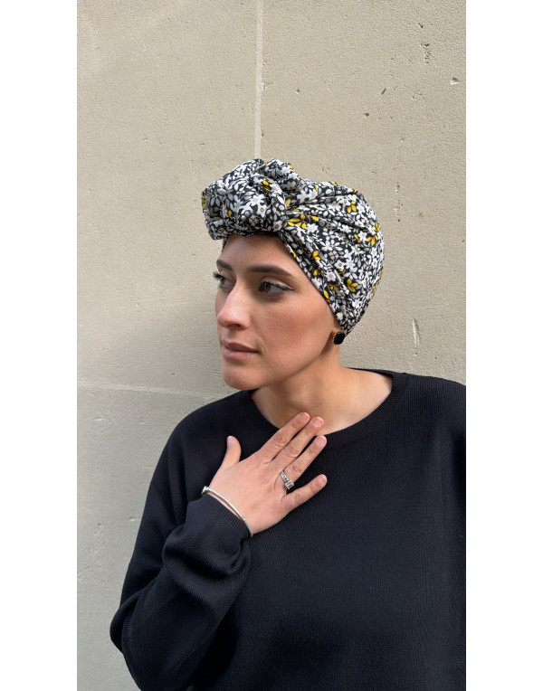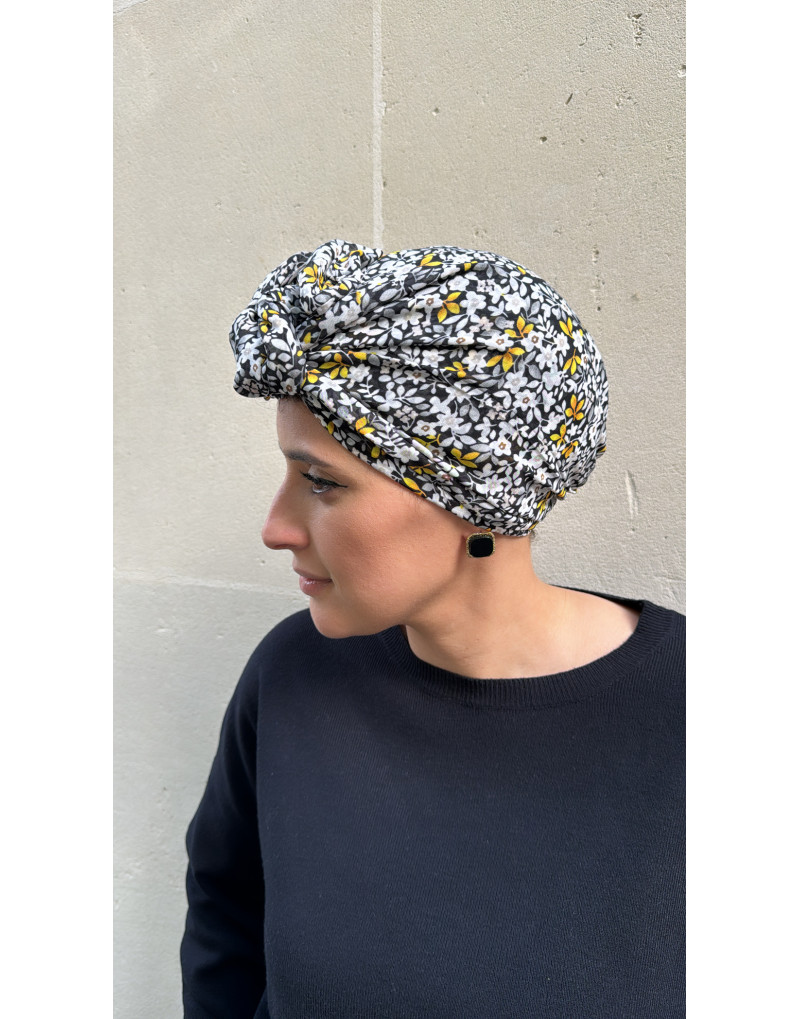 Turban en mousseline fleurie noir et jaune – Élégance florale structurée
