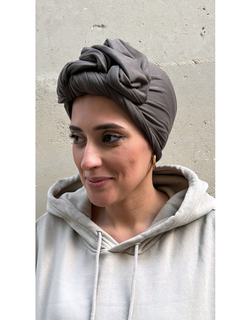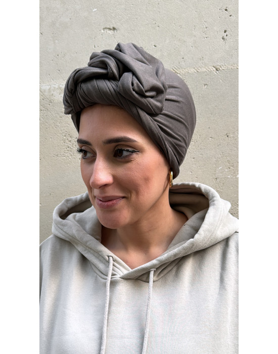 Ce turban en jersey de coton marron kaki allie douceur et confort pour un usage décontracté ou habillé. Sa matière souple et respirante épouse parfaitement la tête, offrant un maintien agréable tout au long de la journée. La couleur marron kaki, naturelle et tendance, apporte une touche élégante et polyvalente à toutes vos tenues.